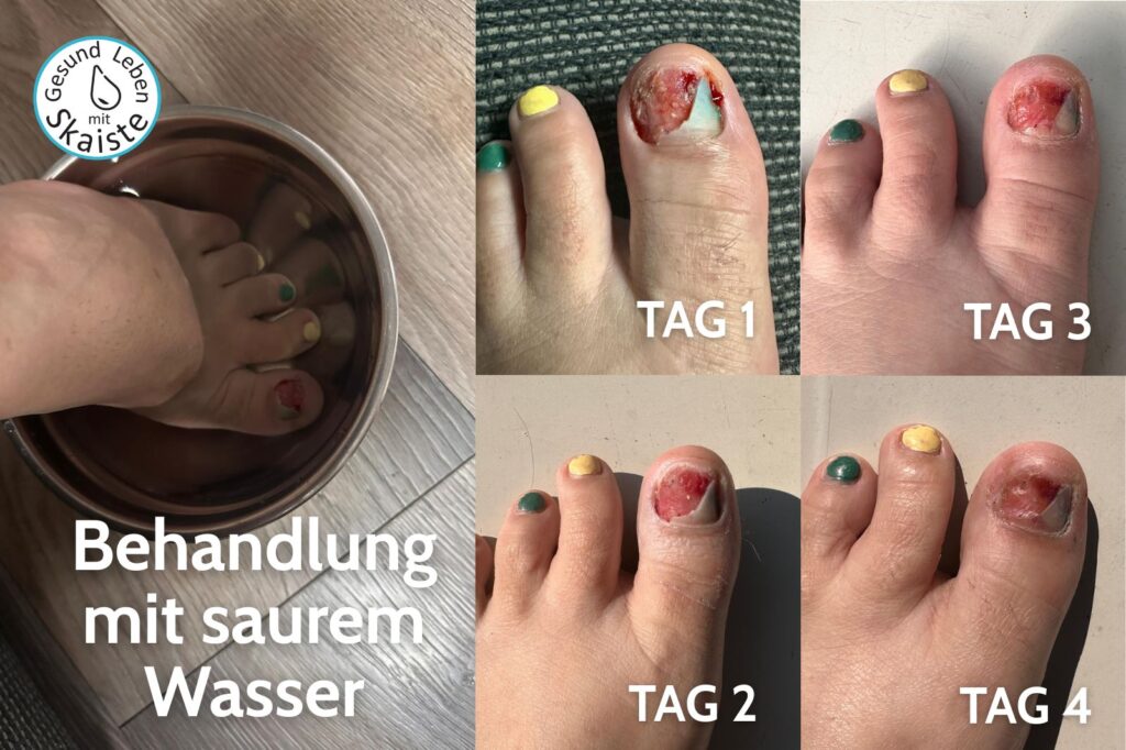 Liebe Skaiste! Sieht zwar nicht so toll aus, aber ich bin so dankbar und begeistert! Vom barfuß-in-den-Sneakers-Gehen, vor lauter schnell-schnell, habe ich zwischen den Zehen offene Stellen bekommen und am anderen Fuß so komische Bläschen. Tut natürlich weh, juckt und sieht nicht gerade gut aus. Da habe ich an zwei Abenden hintereinander 30 Minuten lang mit dem Wasser aus dem kleinen Behälter ein Fußbad gemacht, nicht getrocknet, sondern an der Luft trocknen lassen … und siehe da … alles wieder gut! Dankeschön! 😊😊😊
