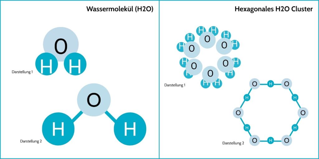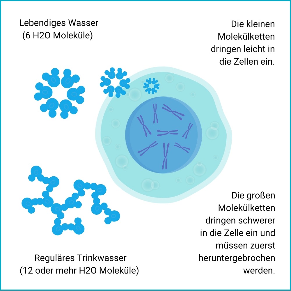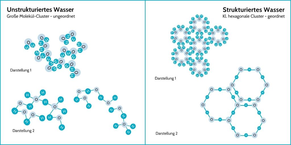 Die hexagonale Struktur ist kleiner und geordneter als die unregelmäßigen, größeren Molekül-Cluster (Molekülketten), die wir in gewöhnlichem Leitungs- oder Flaschenwasser (auch Mineralwasser) finden. Aufgrund seiner kleineren Cluster kann sogenanntes strukturiertes Wasser besser von den Zellen aufgenommen werden und unterstützt dadurch die Zellfunktion , den Stoffwechsel und die Entgiftung im Körpe r effektiver.